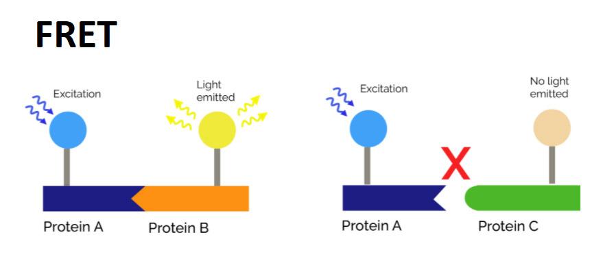 由于 FRET 发生在分子级短距离内,是分析蛋白 - 蛋白相互作用、DNA - 蛋白相互作用及蛋白构象变化的理想工具。