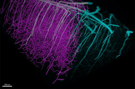 Researchers interested in tracing blood vessels get the new Loop algorithm for the efficient detection of dense vascular networks inside the brain or other organs. The characteristic feature of the blood vessel network is the large diameter difference between the main thick vessels and the small capillaries, so the Imaris 10 Filament Tracer introduced a new multi-scale seed point feature for accurate detection and measurements. From the blood vessels’ model researchers can derive measurements such as segment length and total length, diameter, mean segment intensity and orientation of segments.
